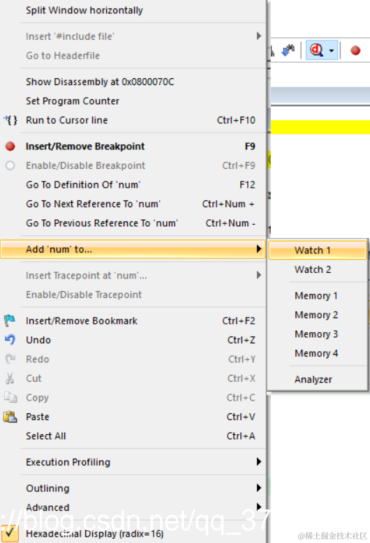 选中num变量右击,添加到watch1中,在10号标注处可以选择watch1,查看num变量的执行情况。