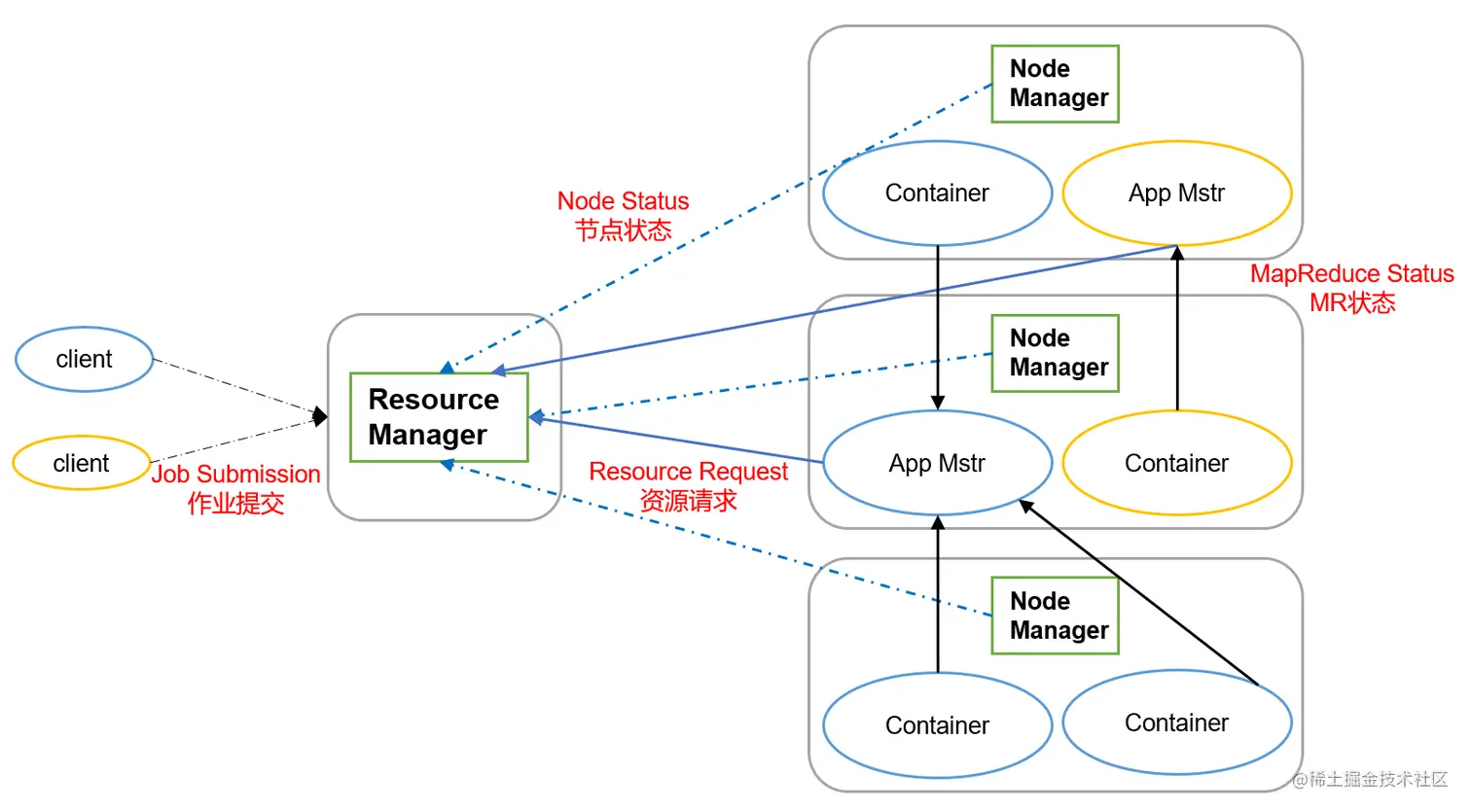 Container:是YARN中的资源抽象,封装了某个节点上的多维度资源,如内存、CPU、磁盘、网络等。