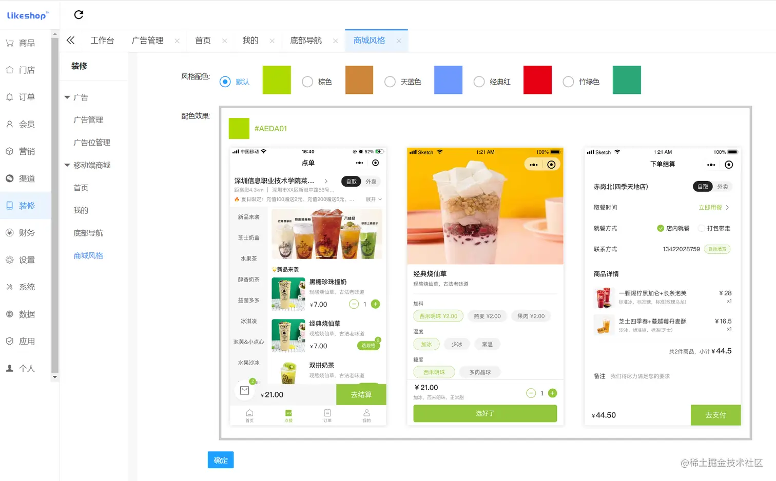 用户可以自行选择商品、小料等规格,商城的商品由商家在后台进行管理
