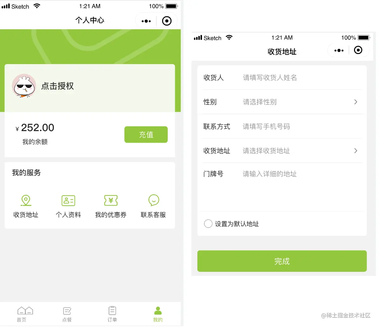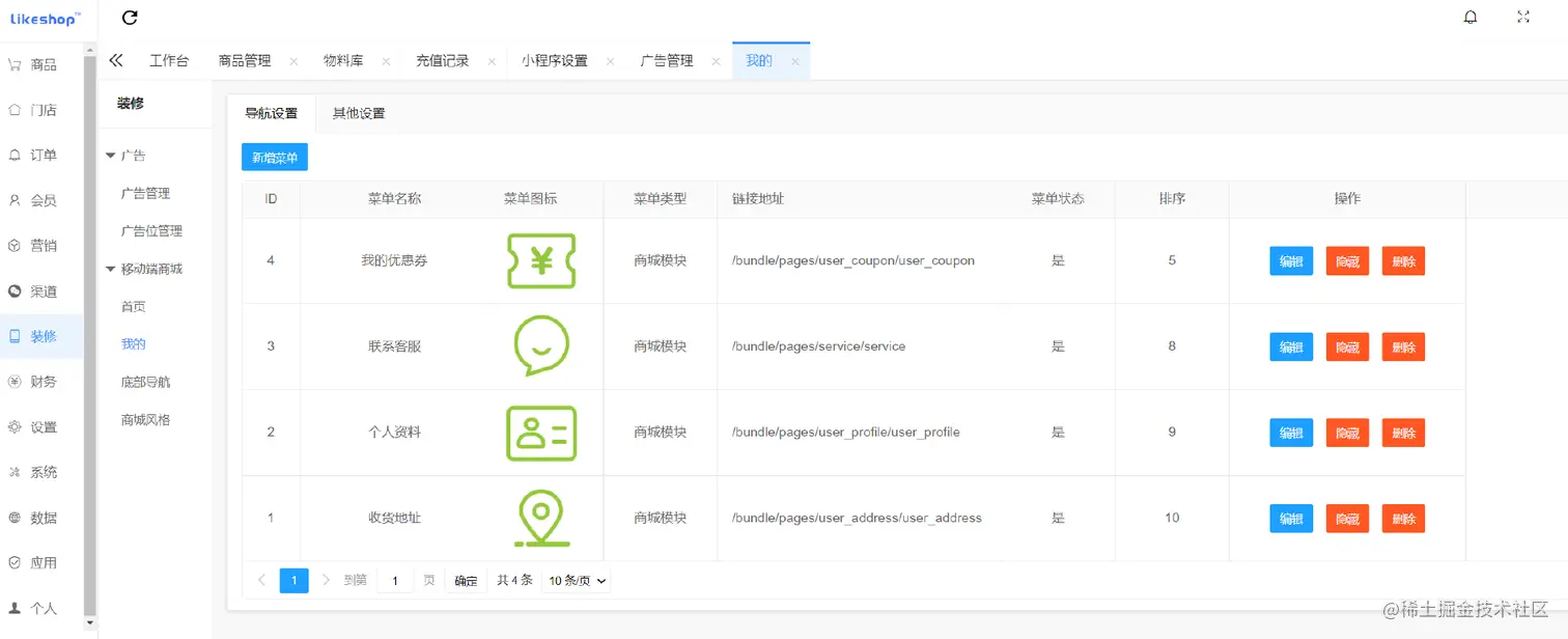 管理用户的收货地址、个人资料、优惠券、联系客服等,可以自定义设置