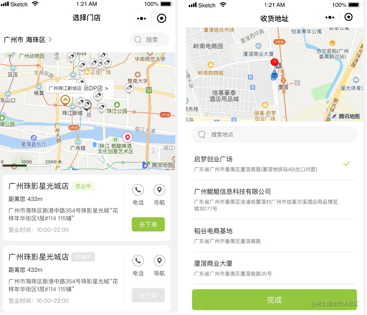 用户选择门店自提,可选择自提的门店;外卖配送,需要选择配送地点,