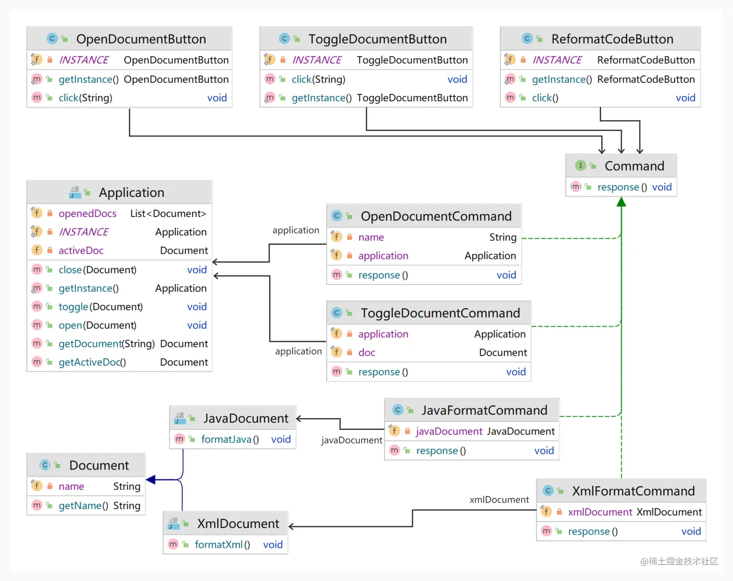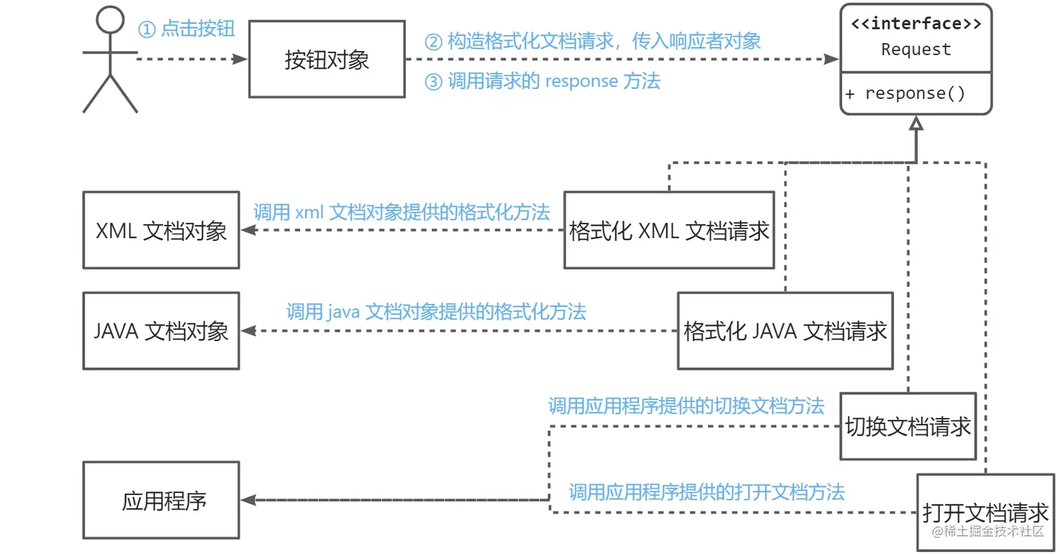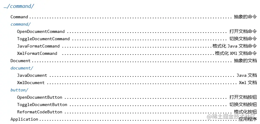 Application,并负责在命令发起时将请求传达给应用程序; - JavaFormatCommand、XmlFormatCommand:分别代表Java文件格式化命令和Xml文件格式化命令。他们负责在命令发起时将请求传达给具体格式的文档对象,让文档对象负责自身的格式化工作;