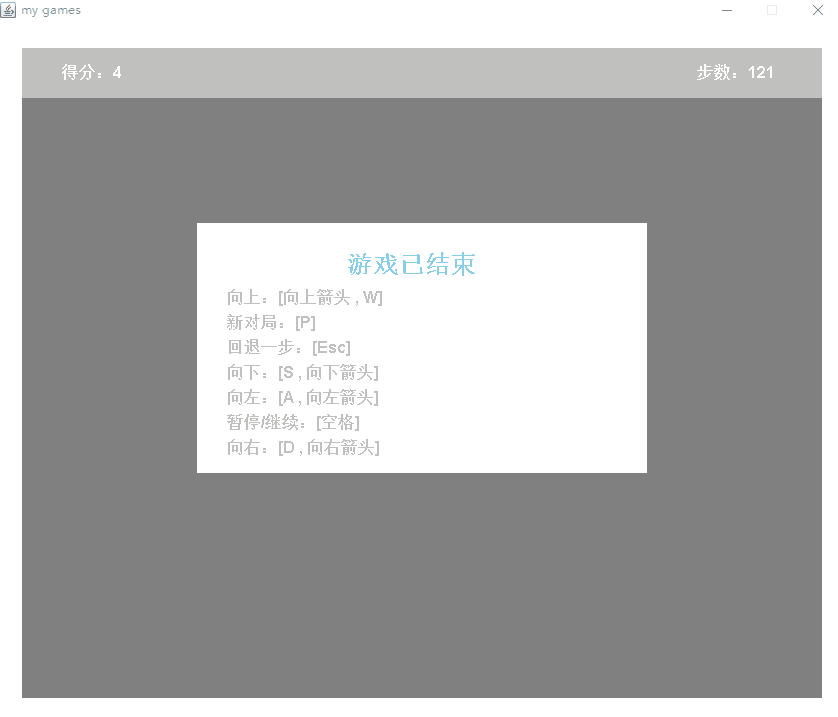 f. 当游戏处于暂停或结束时,可使用后退一步功能恢复当前游戏到最近一次转向之前的状态;