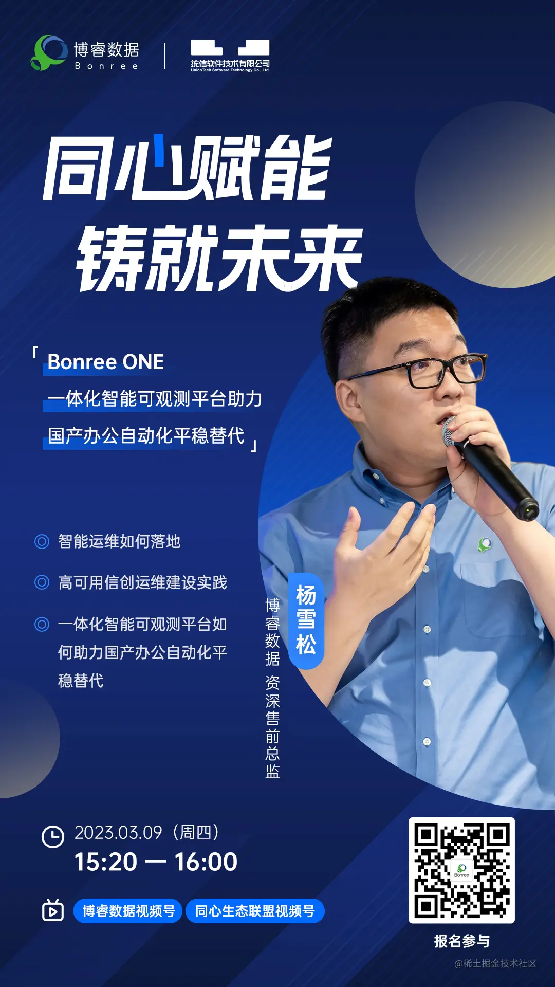 3月9日15:20-16:00,博睿数据联合统信软件同心生态联盟推出“匠心智课云课堂”《金融信创应用实践分享》直播,博睿数据资深售前总监杨雪松带来《一体化智能可观测平台助力国产办公自动化平稳替代》的演讲,带来关于行业洞察与解决方案的分享!