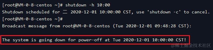 提示“The system is going down for power-off at Tue 2020-12-01 10:00:00 CST!”。
