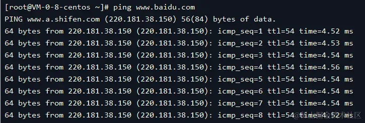查看当前网络与百度是否通讯正常,执行命令: