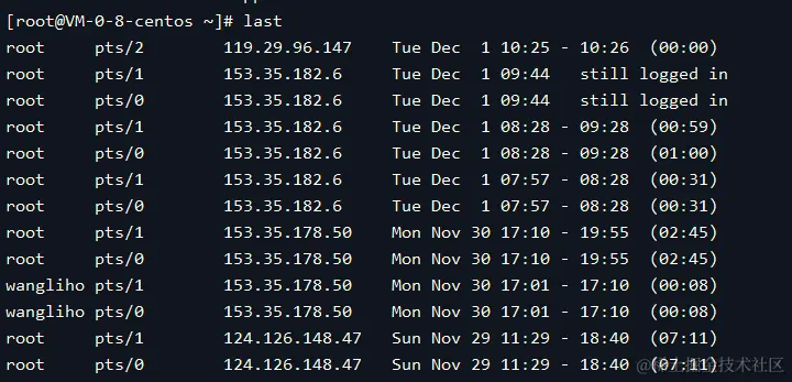 命令作用:列出当前与过去登录过系统的用户信息