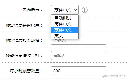 默认使用浏览器语言,选项分别有自动(识别浏览器语言)、简体中文、繁体英文、英文。