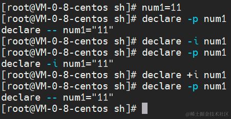 声明变量num1,执行 declare -p num1 查看num1的类型。 给变量设定整数类型 declare -i num1,再次查看num1的类型。 给变量取消整数类型 declare +i num1,再次查看num1的类型。