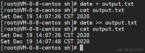 将date命令结果输出到文件output.txt中,然后查看文件内容: