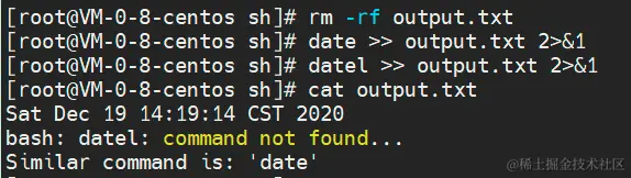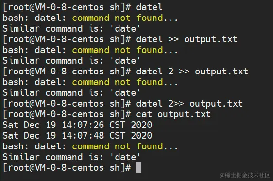 (1)date命令是正确输出时间的,而datel命令会报错。 (2)直接执行错误命令 datel >> output.txt ,将结果输出到文件,命令同样报错; (3)执行命令 datel 2 >> output.txt,命令同样报错,2和>>之间不能有空格; (4)必须使用命令 datel 2>> output.txt,将错误结果输出到文件;