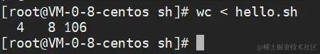 wc命令统计输入的信息,将文件hello.sh作为wc命令的输入,然后进行统计:
