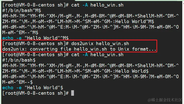 将hello_win.sh脚本,转换成Linux格式。执行命令:
