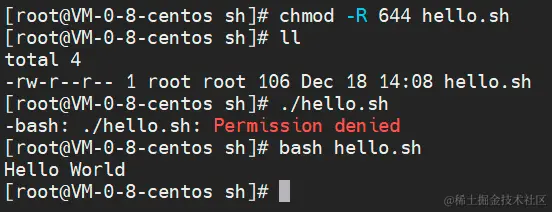 例如:将hello.sh脚本权限变更为644,再通过./hello.sh和bash hello.sh方式执行脚本,结果如下图所示: