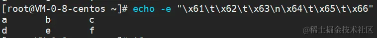 echo -e "\x61\t\x62\t\x63\n\x64\t\x65\t\x66"