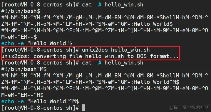 对比转换前后文件内容,发现格式发生了变化,从$——>^M$。如下图所示: