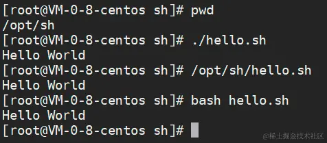 hello.sh脚本在/opt/sh目录下面,进入/opt/sh目录,有三种方式执行shell脚本: