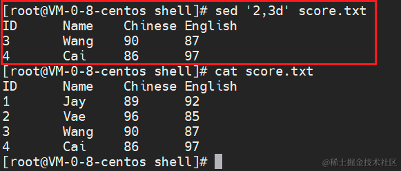 从上图中可以看到,删除了第二行到第三行的数据。再次查看文件内容,发现文件本身没有被修改。