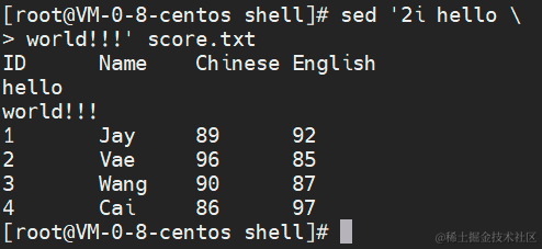 - i : 插入,在当前行插入一行或多行。插入多行时,除最后 一行外,每行末尾需要用“\”代表数据未完结;