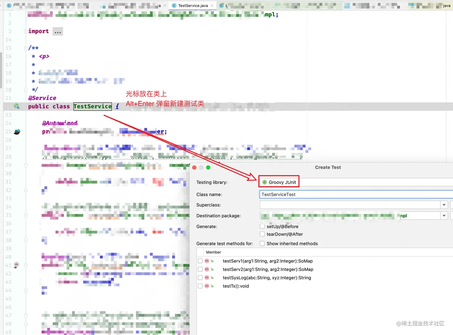 自动在 test 下新建 TestServiceTest.groovy 文件