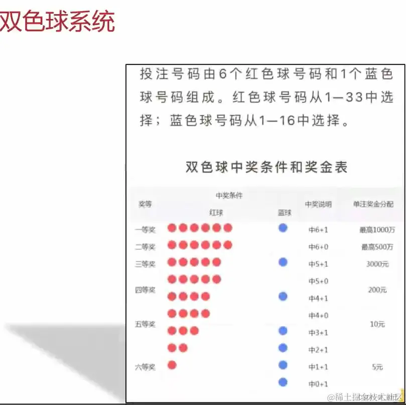 //一等奖 6个红球 1个蓝球 数组长度:7