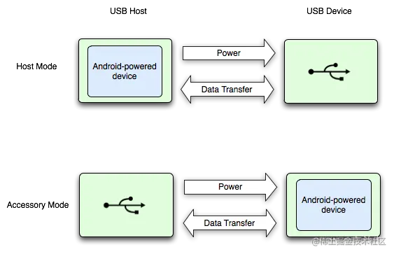 下图展示了这两种模式之间的差异。当 Android 设备处于主机模式时,它会充当 USB 主机并为总线供电。当 Android 设备处于 USB 配件模式时,所连接的 USB 硬件(本例中为 Android USB 配件)充当主机并为总线供电。