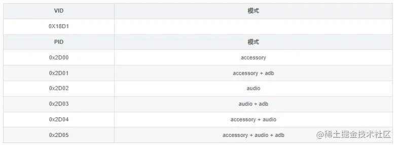 判断 Android 设备处于 Accessory Mode 时,VID 和 PID 值必须满足如下条件如下: