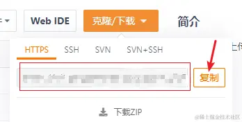 复制项目地址,点击克隆/下载,会出现不同协议的项目地址,点击复制,如下图: