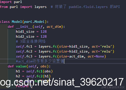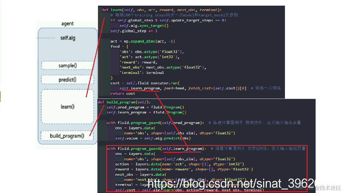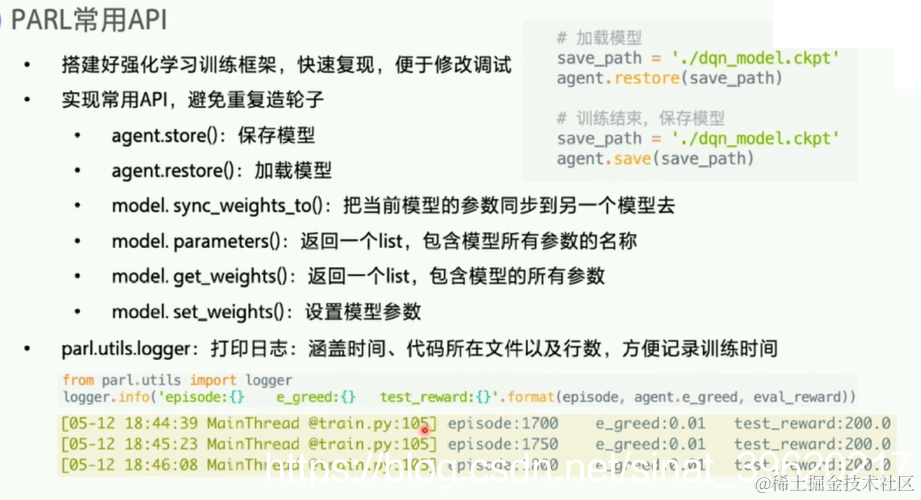 Agent把产生的数据传给algorithm,algorithm根据model的模型结构计算出Loss,使用SGD或者其他优化器不断的优化,PARL这种架构可以很方便的应用在各类深度强化学习问题中。
