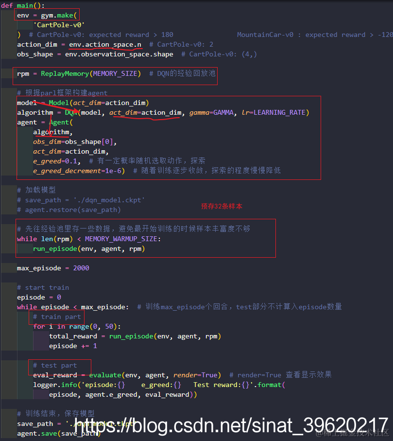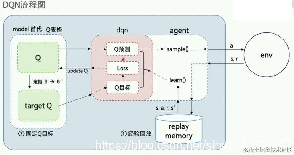 DQN还是一个Q-learning算法,更新方式一致。为了更好的探索环境,同样的也采用ε-greedy方法训练。 -