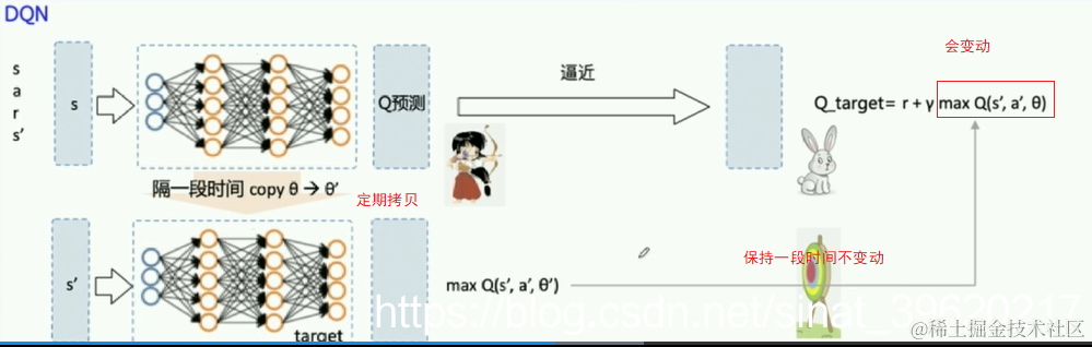 Fixed-Q-Target:主要解决算法训练不稳定的问题。复制一个和原来Q网络结构一样的Target Q网络,用于计算Q目标值。