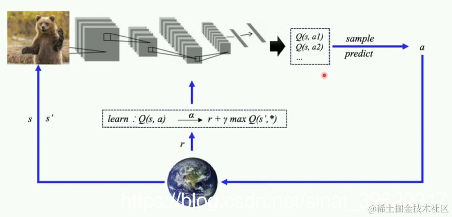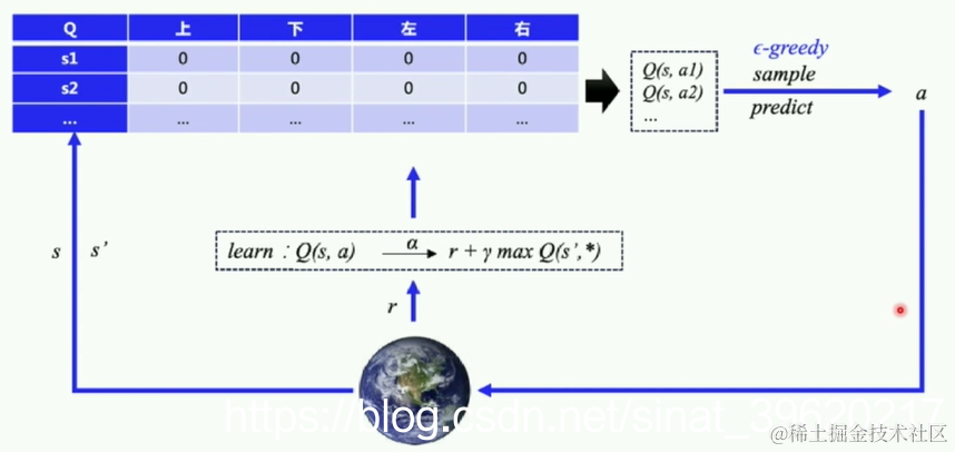 1.首先查表所有动作对应q值取出来,最有动作就是q值最大对应动作,2.在输出给环境,然后输出r和下一状态s Q(s,a)函数逼近目标值target,maxQ来更新。当然也用sample进行探索。