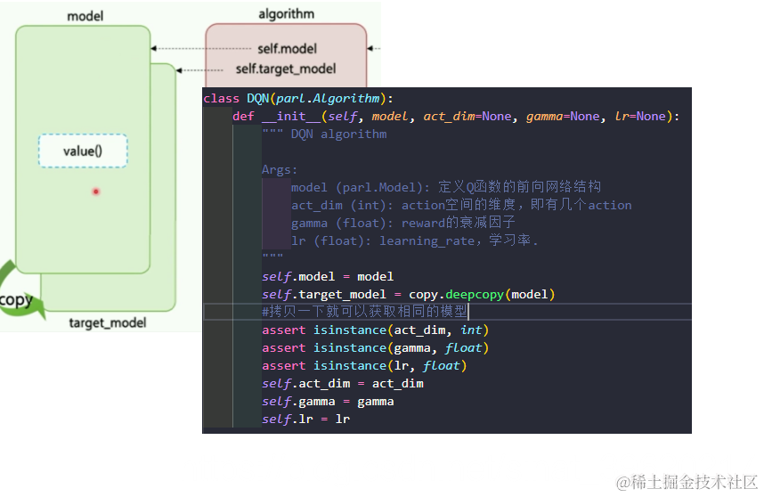 Algorithm定义了具体的算法来更新前向网络(Model),也就是通过定义损失函数来更新Model,和算法相关的计算都放在algorithm中。