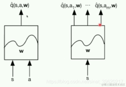 这里近似可以有不同类别,如上图输入一个状态s和动作a得到一个q值,或者只输入状态s,有多少个动作就输出多少个Q值,右边容易求解最大Q值。