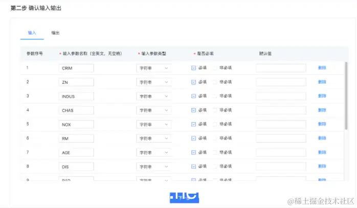 填写模型的输入输出参数. 以房价预测的线性回归模型为例(参数参考), 添加参数如下图所示.