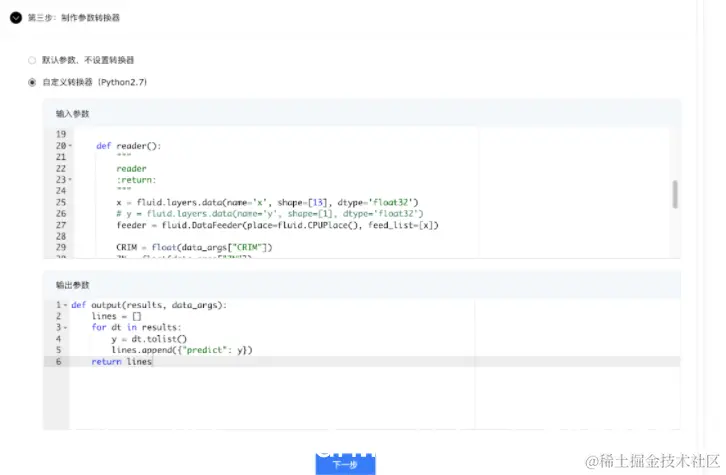 def reader_infer(data_args): """ reader_infer 输入参数转换器方法 :param data_args: 接口传入的数据,以k-v形式 :return [[]], feeder """ #构造内容 pass输出参数转换器方法