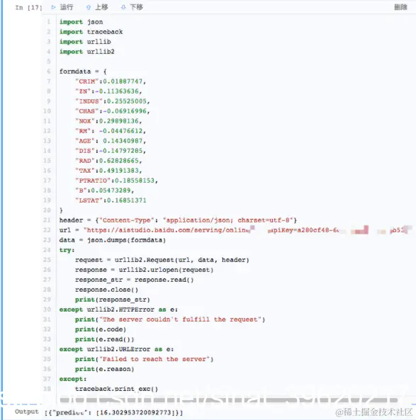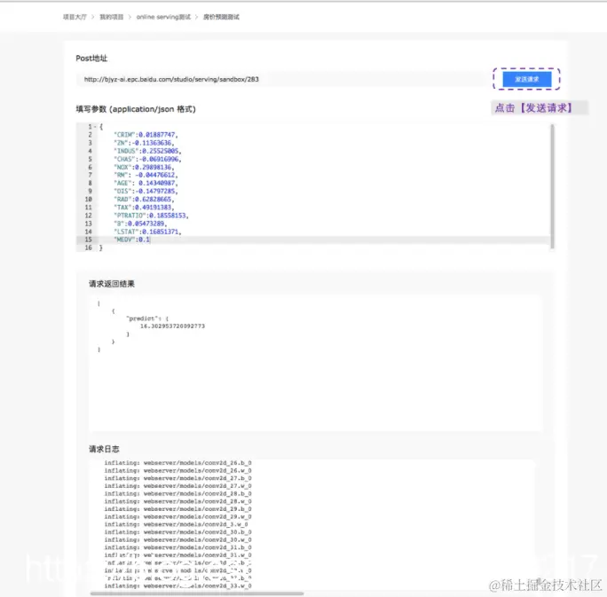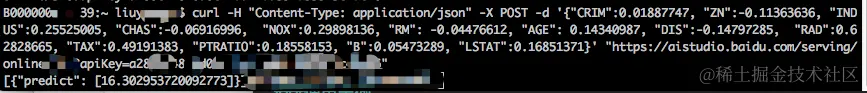 curl -H "Content-Type: application/json" -X POST -d '{"CRIM":0.01887747, "ZN":-0.11363636, "INDUS":0.25525005, "CHAS":-0.06916996, "NOX":0.29898136, "RM": -0.04476612, "AGE": 0.14340987, "DIS":-0.14797285, "RAD":0.62828665, "TAX":0.49191383, "PTRATIO":0.18558153, "B":0.05473289, "LSTAT":0.16851371}' "https://aistudio.baidu.com/serving/online/xxx?apiKey=xxxxxxxxxx"