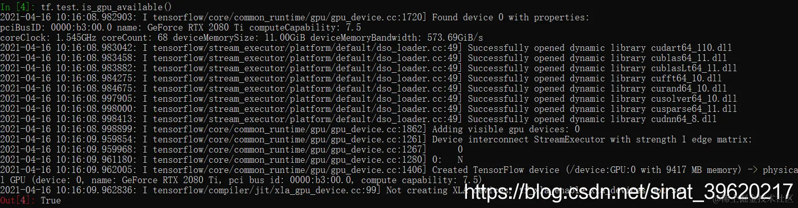 # 如果出现: WARNING:tensorflow:From <ipython-input-1-46ff889b56b7>:2: is_gpu_available (from tensorflow.python.framework.test_util) is deprecated and will be removed in a future version. Instructions for updating: Use `tf.config.list_physical_devices('GPU')` instead. True说明GPU是可用的,这里的警告是说,这个测试命令即将被抛弃,应该使用tf.config.list_physical_devices(‘GPU’),如下: