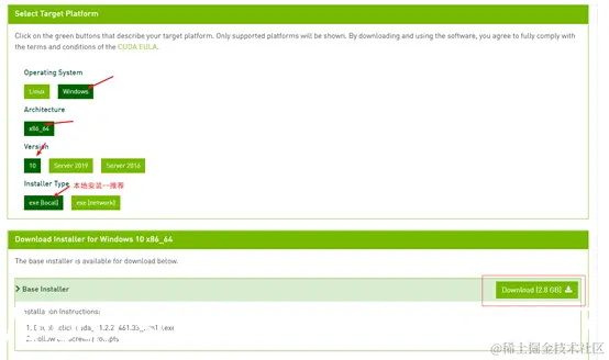 CUDA 软件安装 打开 CUDA 程序的下载官网:这里我们使用 CUDA11.2版本,依次选择 Windows 平台----x86_64 架构----win10 系统----exe(local)本地安装包,再选择 Download 即可下载 CUDA 安装软件。