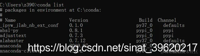 - 输入conda list 命令即可查看 Python 环境已安装的库,如果是新安装的 Python 环境,则列出的库都是 Anaconda 自带的软件库。