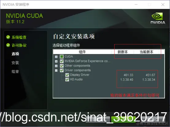 如果“Current Version”大于“New Version”,则需要取消“Display Driver”的勾,如果小于或等于,则默认勾选即可,设置完成后即可正常安装。