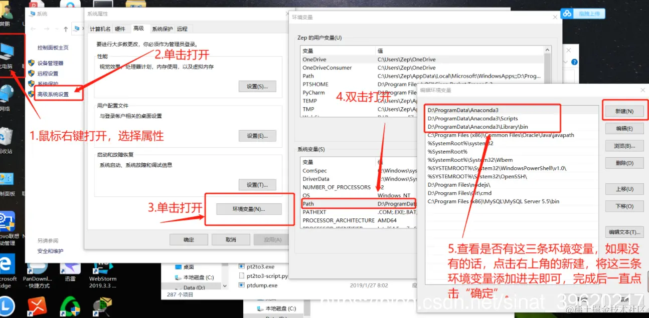 - 打开文件浏览器,在“我的电脑”上右击,选择“属性”,选择“高级系统属性”,选择“环境变量”。