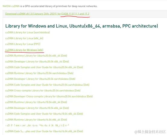 - 选择 CUDA 11.2 匹配的 cuDNN 版本,并点击“cuDNN Library for Windows 10”链接即可下载 cuDNN 文件,需要注意的是:cuDNN 本身具有一个版本号,同时它还需要和 CUDA 的版本号匹配上,不能下错不匹配 CUDA 版本号的 cuDNN 文件