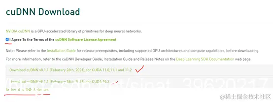 - 登录后,进入 cuDNN 下载界面,勾选“I Agree To the Terms of the cuDNN Software License Agreement”,即可弹出 cuDNN 版本下载选项。