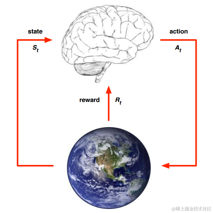 上面的大脑代表我们的算法执行个体,我们可以操作个体来做决策,即选择一个合适的动作(Action)AtAt。下面的地球代表我们要研究的环境,它有自己的状态模型,我们选择了动作AtAt后,环境的状态(State)会变,我们会发现环境状态已经变为St+1St+1,同时我们得到了我们采取动作AtAt的延时奖励(Reward)Rt+1Rt+1。然后个体可以继续选择下一个合适的动作,然后环境的状态又会变,又有新的奖励值。。。这就是强化学习的思路。