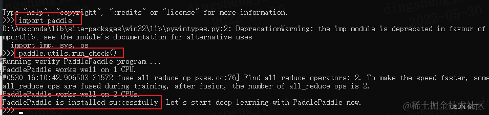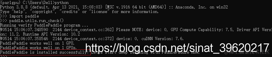 安装完成后您可以使用 python 进入python解释器,输入import paddle ,再输入 paddle.utils.run_check()如果出现PaddlePaddle is installed successfully!,说明您已成功安装。