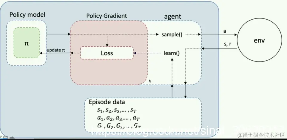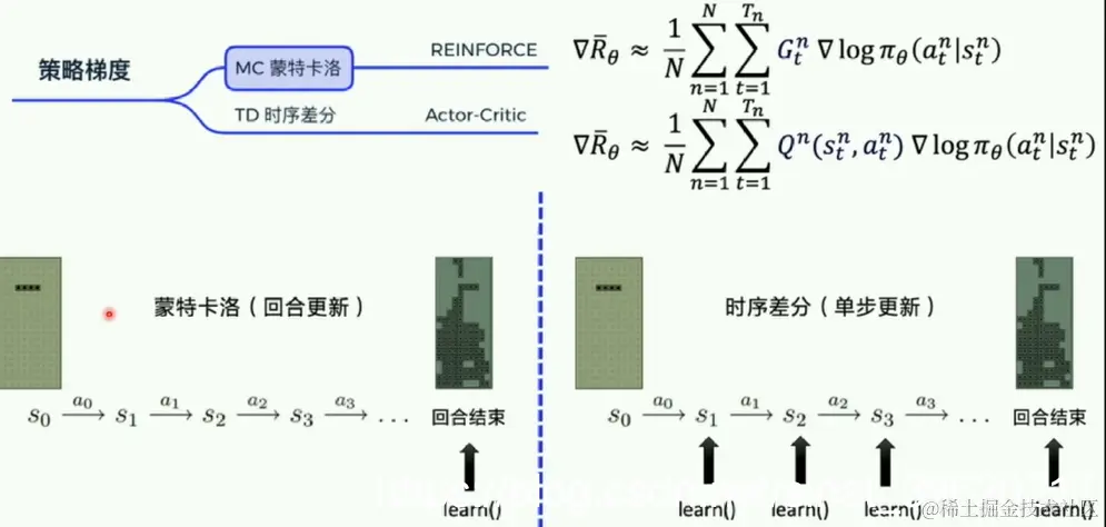 拿到一条轨迹,在进行learn,可以得到每个轨迹的reward进行求解期望,未来总收益-------回合更新