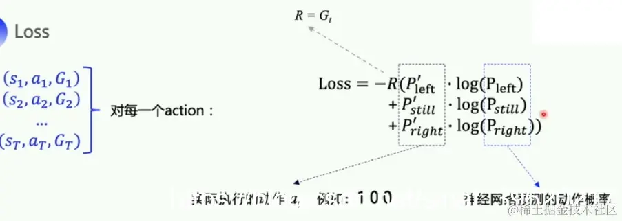 obs, action, reward分别是S、A、R;先得到预测动作概率然后和onehot(实际动作)相乘;再乘以reward,就得到LOSS。即上面对应的公式。
