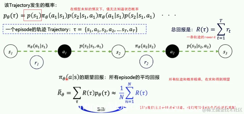 π(s,a)的期望回报:所有的轨迹获得的回报R与对应的轨迹发生概率p的加权和,当N足够大时,可通过采样N个Episode求平均的方式近似表达。
