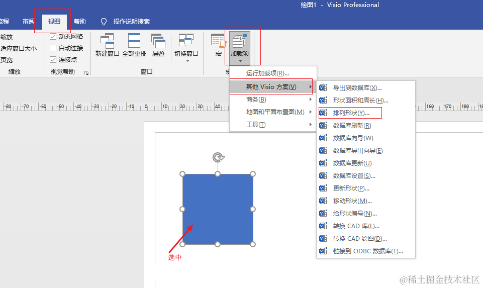 3.选中该正方形,点击菜单栏中【视图】,在视图下找到宏,点击【加载项】。
